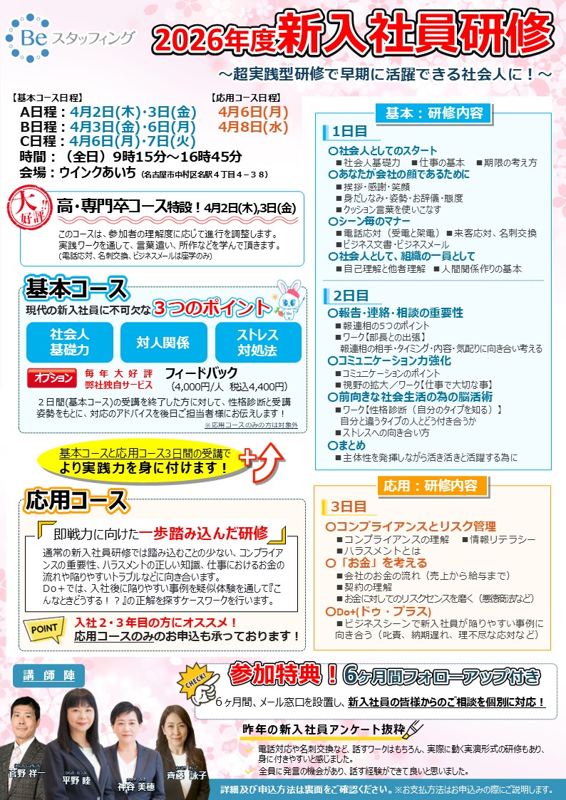 次の記事 : 9月10月開催 2026年度新入社員フォローアップ研修のご案内