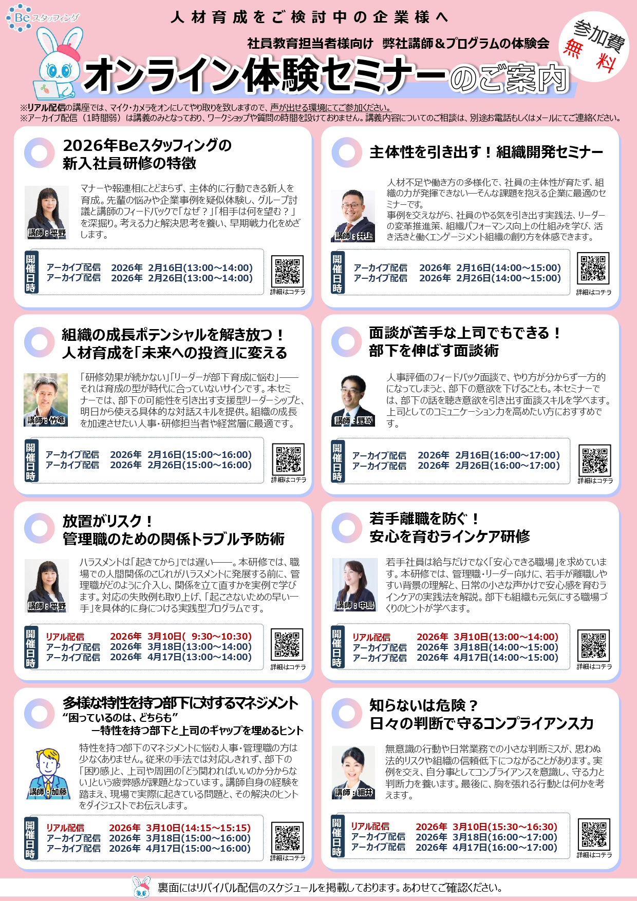 ※※※Beスタッフィングは新入社員研修から管理職研修、メンタルヘルス・ハラスメント研修などの企業研修と