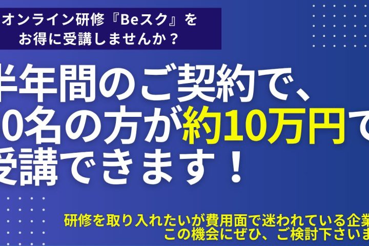 弊社サービス【定額制オンライン研修「Beスク」】が、 人材開発支援助成金・人への投資促進コースの「定額制訓練」の対象となります。 対象受講者が対象講座を10時間以上受講いただければ、簡単な手続きで、 ■中小 […]